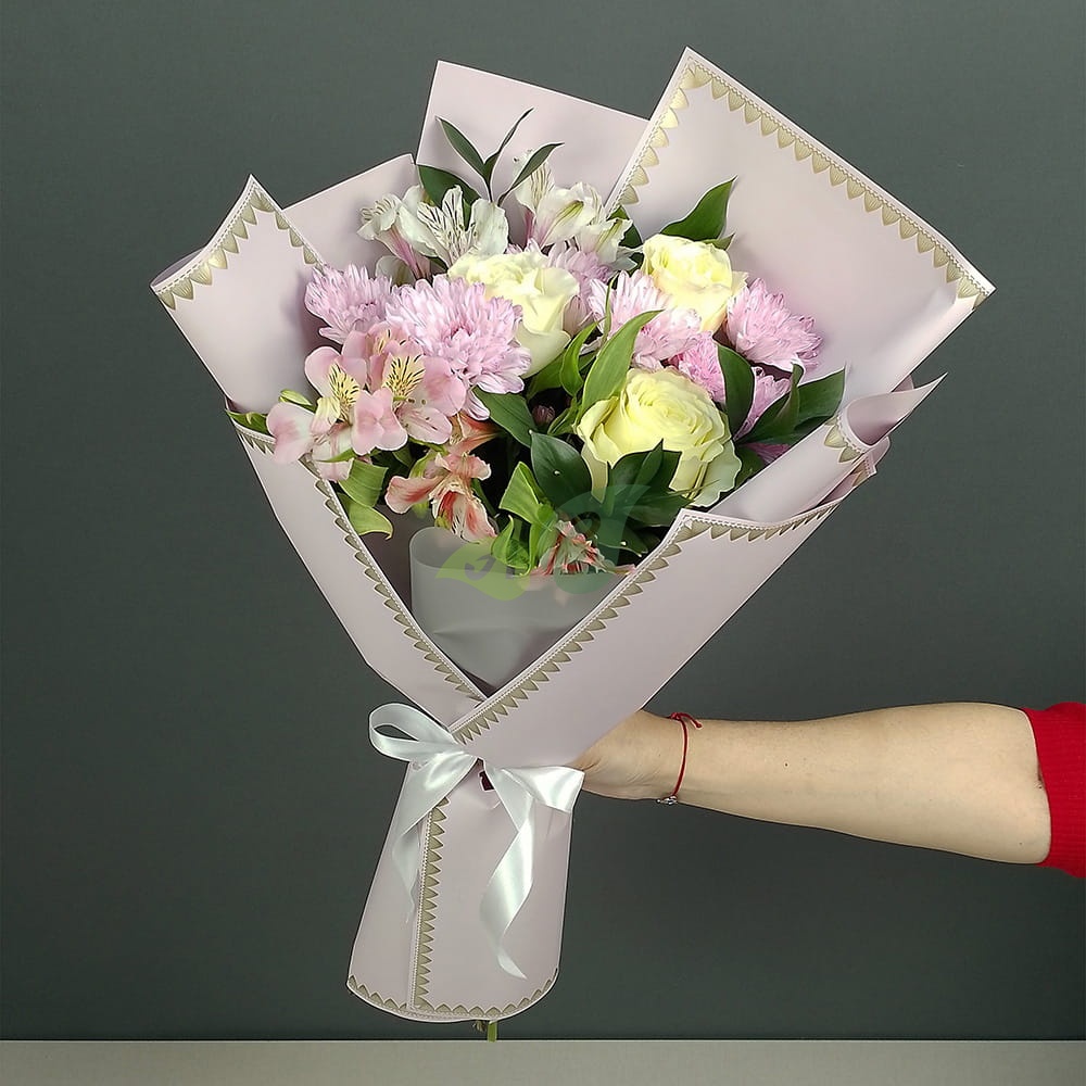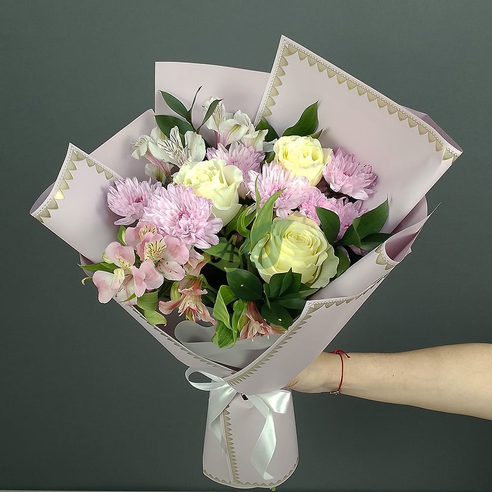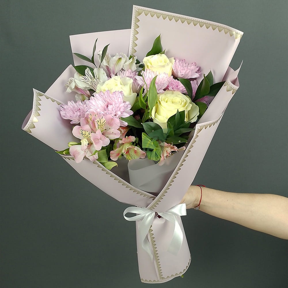 Состав и характеристики букета из хризантем, альстромрий и роз "Полёт бабочки":